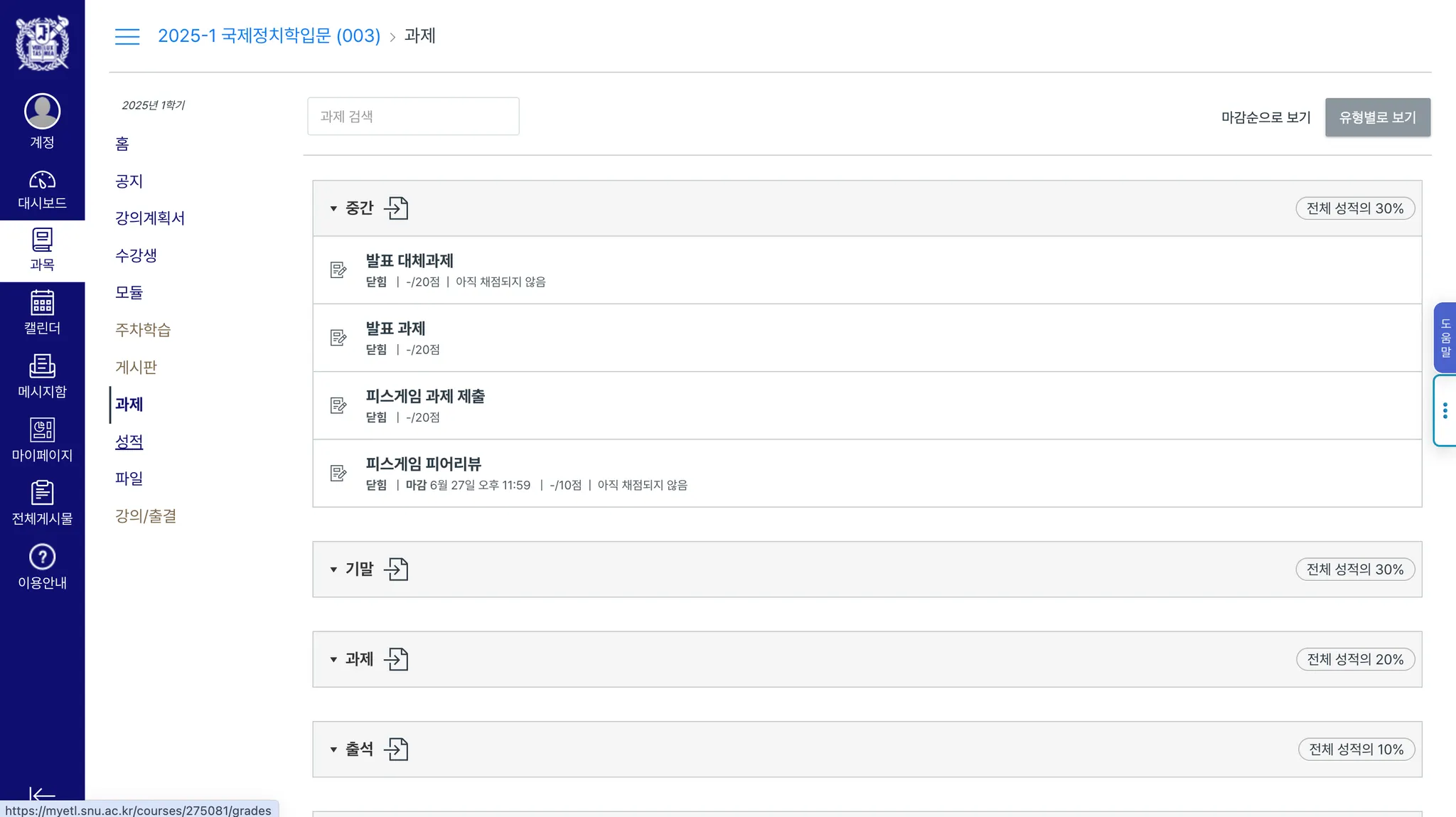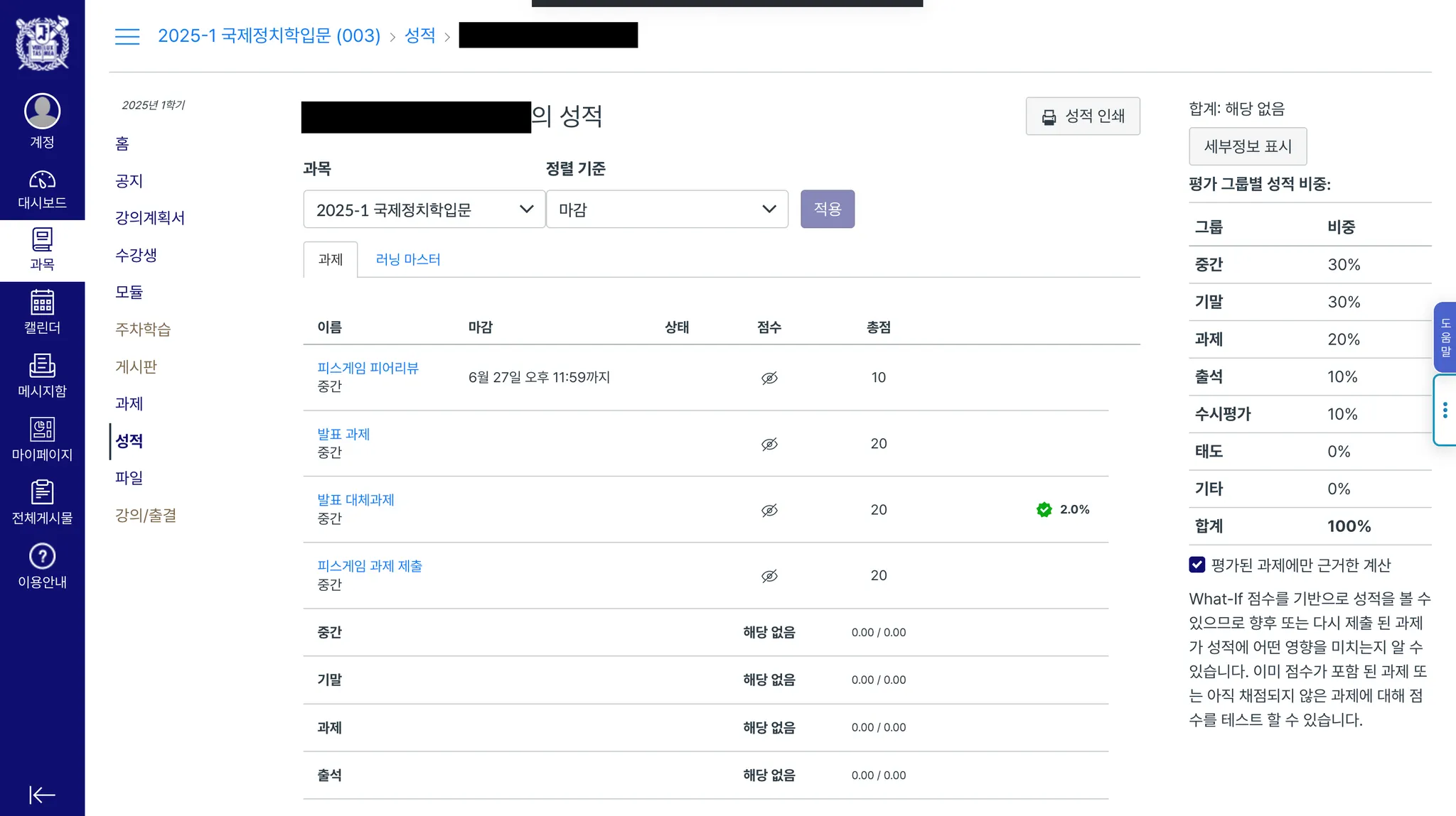 강좌에 접속하여, 좌측 메뉴에서 '성적'을 선택한다.