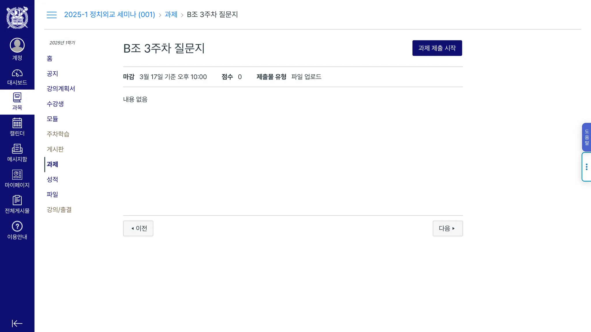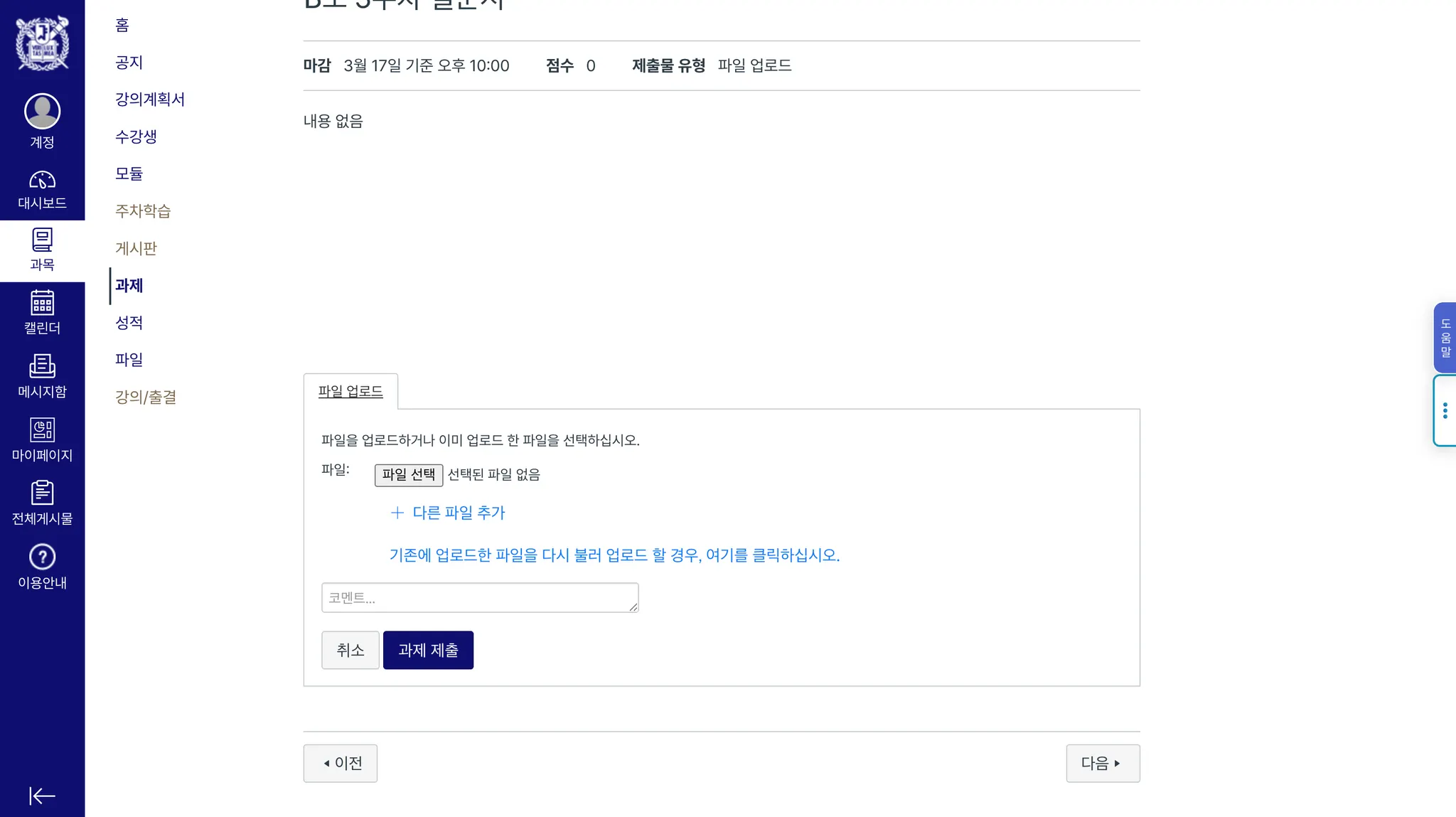 강좌→ 과제 →과제 제출 시작→파일 선택 → 파일 업로드