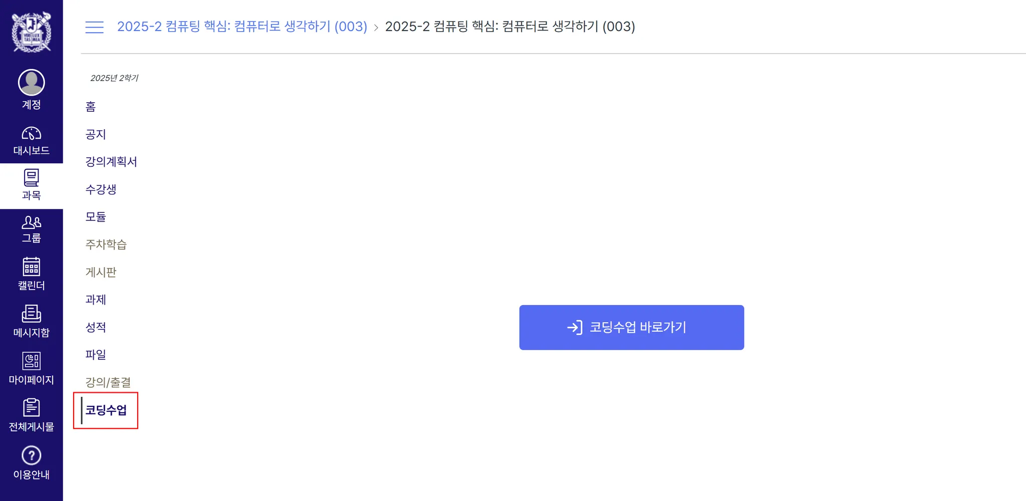 컴퓨팅 교양 교과목에서 자주 활용되는 학습 경험 플랫폼으로, 사진과 같이 교과목 개설 시 ETL에 해당 플랫폼으로의 연결 링크가 제공된다.