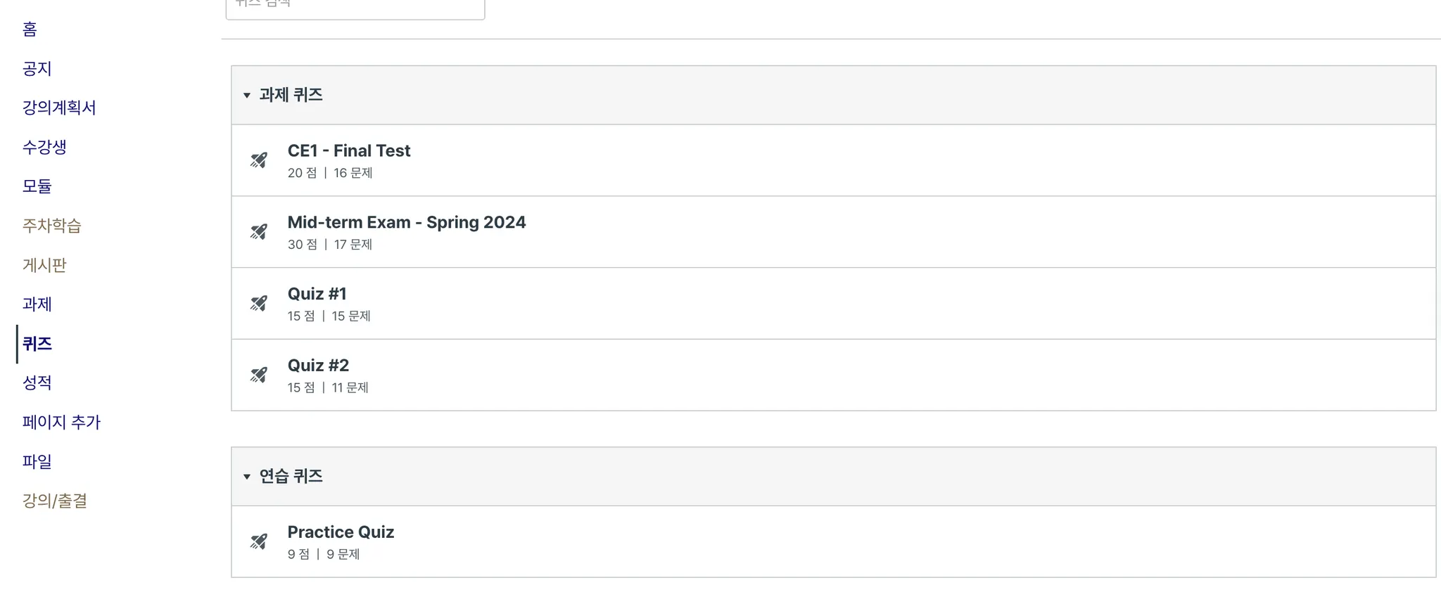 강좌→ 퀴즈 → 퀴즈 선택→ 시작