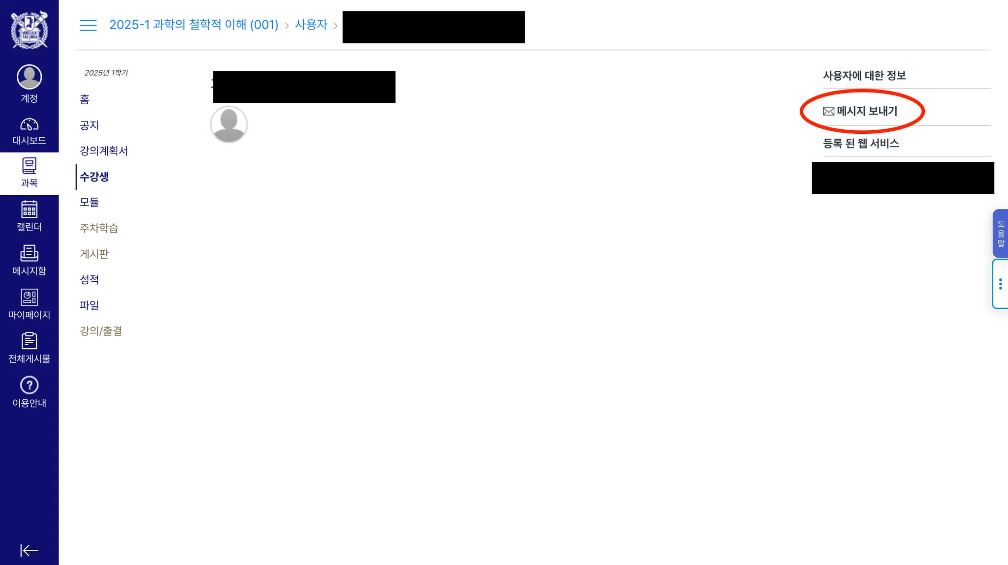 강좌에 접속하여 같은 강좌 내 학생 또는 교수자에게 메시지를 전송할 수 있다.