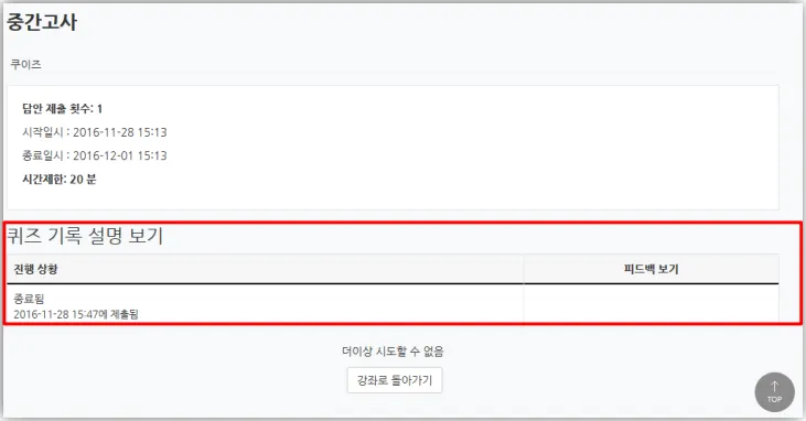 ※ 응시 횟수에 제한이 없다면, '다시 응시하기' 버튼을 눌러 기한 내에 재응시가 가능하다.