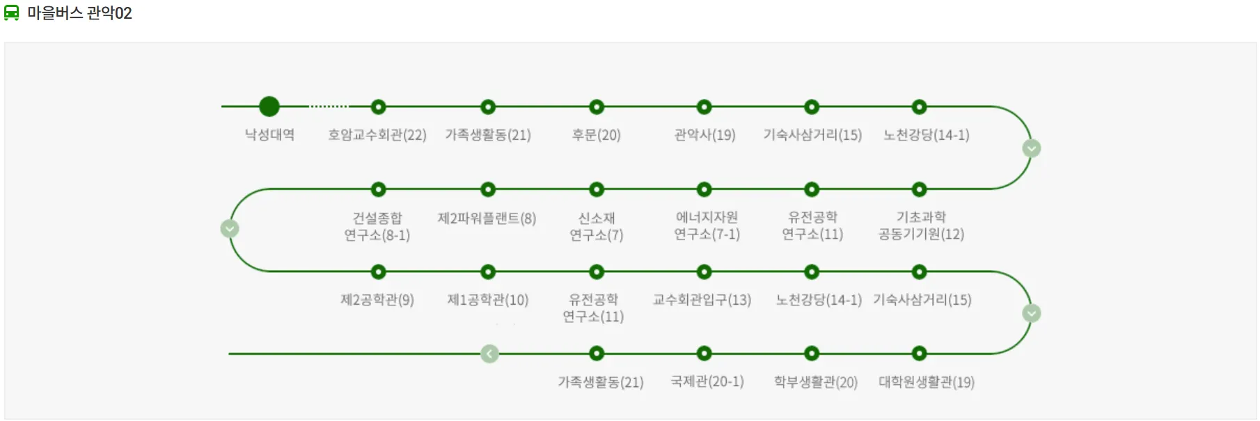 서울대입구역에서 정문까지 올라간 뒤, 사회대와 농생대 쪽으로 올라간다. 내려올 때는 반대로 기숙사 삼거리와 경영대 쪽으로 내려온다.