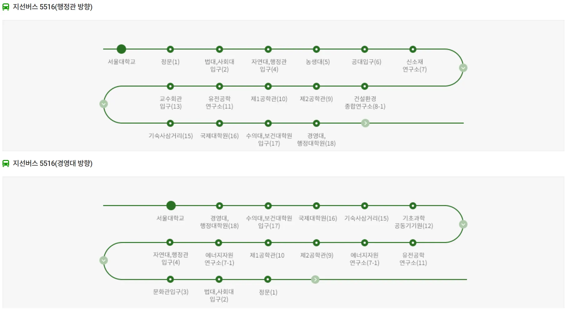 5516은 행정관 방향과 경영대 방향 버스가 따로 있다. 대학동에서 탑승 시 방면에 유의하자.