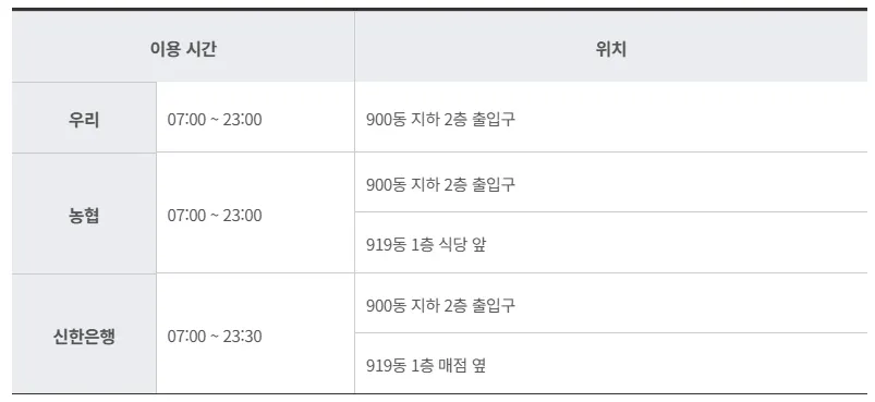기숙사에는 다음과 같이 ATM이 설치되어 있으며, 이외 교내 ATM기 위치는 서울대학교 캠퍼스 맵 어플리케이션에서 확인이 가능하다.