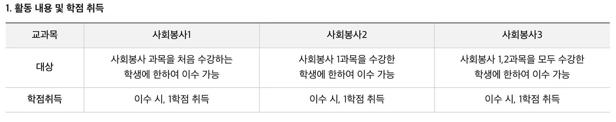 사회봉사교과목을 통해 학생들은 주변의 이웃에 관심을 가지고 더불어 살아가는 공동체 의식을 함양하며, 더 나아가 학생들이 사회적 책임을 실천하는 따뜻한 마음을 가진 진정한 리더로 성장할 수 있도록 돕는 것을 목표로 한다.