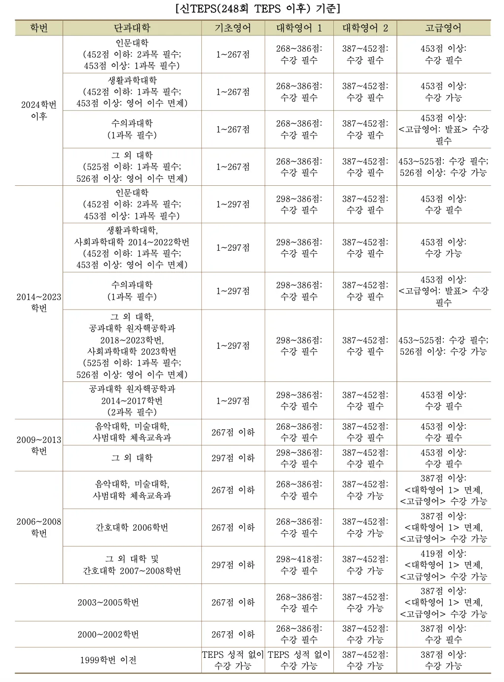 신입생 특별시험이나 그 이후부터 입학 전까지 치른 텝스 점수를 토대로 기초영어, 대학영어1, 대학영어2, 면제가 결정된다.